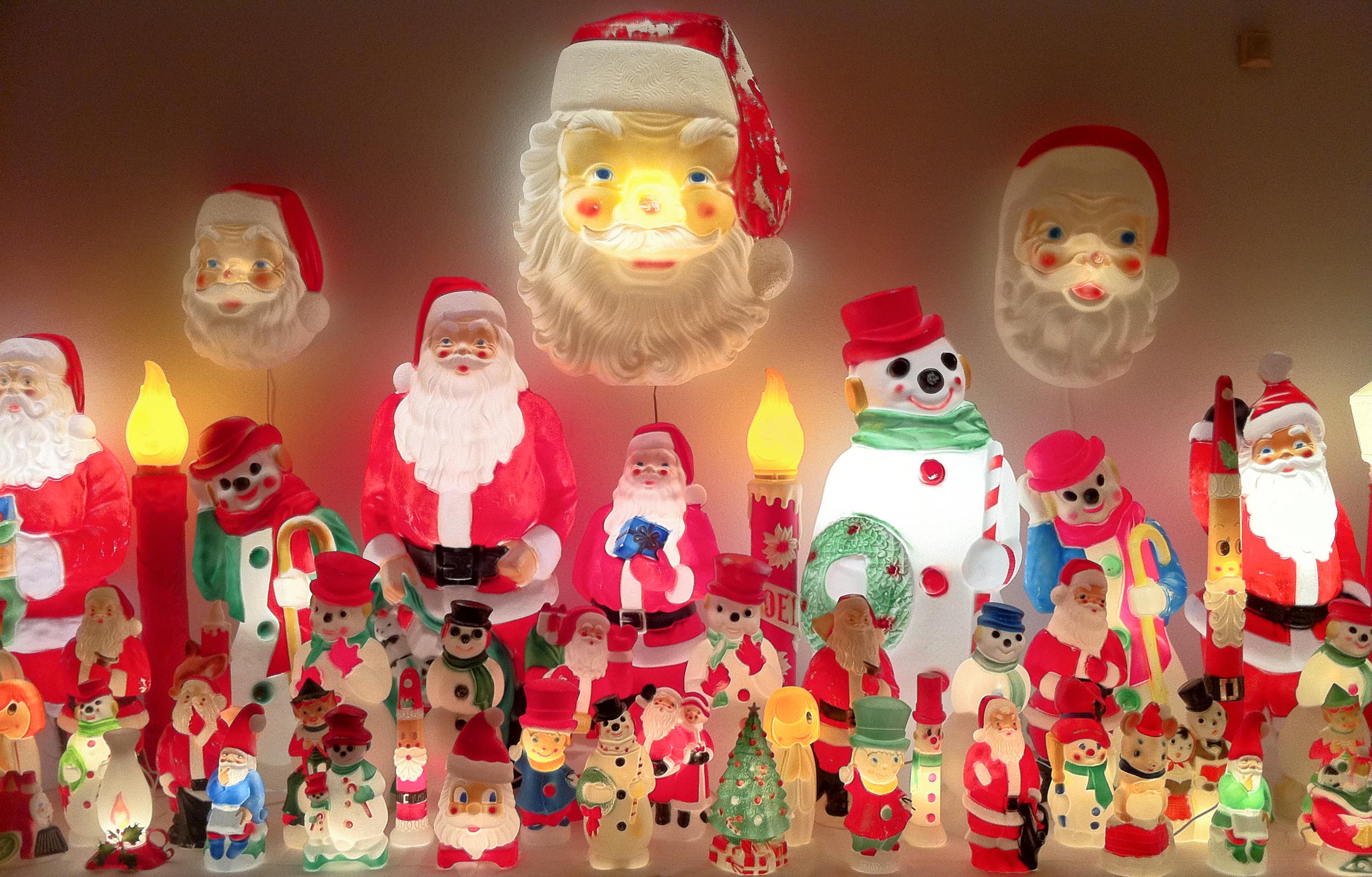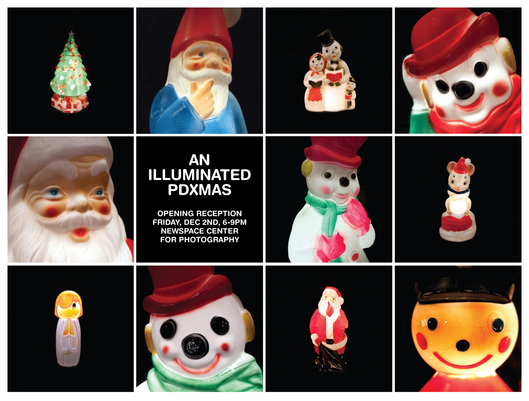 This December, Newspace Center for Photography will host a public display of my personal collection of vintage holiday characters. My fascination with them started many years ago with a large plastic Santa I used to covet from my Grandma’s house. Now decades later…thrift stores, garage sales, antique shops, and eBay auctions have allowed me to indulge my obsession and continue to grow the collection. All the figures were manufactured in the late 60s and 70s by Empire Plastics Corp., a now defunct Tarboro, NC based company. I’m drawn to the consistency in style the Empire characters had back then, an innocence and comfort in their expressions that current lawn and porch decorations just don’t possess. On display will be an assortment of Santas, snowmen, reindeer, and elves, all ranging in size from 13 to 46 inches tall. They’ll be dusted off and plugged in all month, delighting Portland gallery goers with their warm, nostalgic glow.